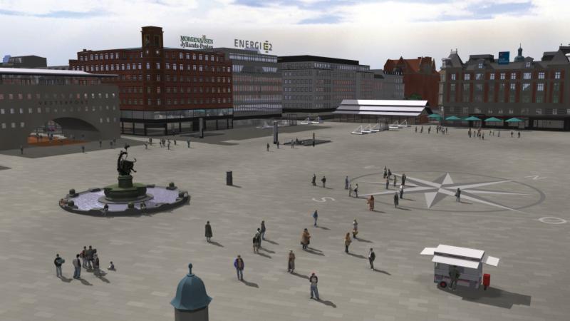 4/4 Rådhuspladsen set fra rådhusets balkon. Pladsen er ryddet for uvedkommende trafikanlæg. Dragespringvandet har fået sit ydre bassin tilbage. En ny Vesterport markerer overgangen til Vesterbro. En stor kompasrose midt på pladsen symboliserer København som havneby og Danmark som søfartsnation.